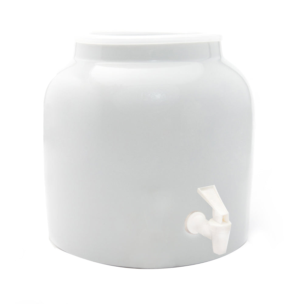 Room temperature only. Dimension of the drink dispenser is approximate 9.5"D Inches x 10"H Inches. Comes with a dispensing faucet valve and plastic ring. Beverage dispenser crock only - water bottle, stand, and lid not included.